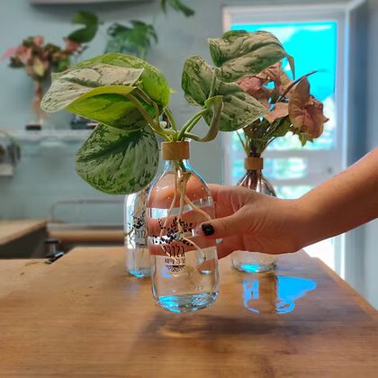 שלושה בקבוקי גלורי עם צמחים הידרופונים בבקבוקי זכוכית שקופים –