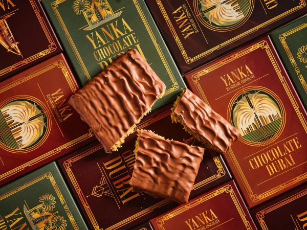 שוקולד דובאי בעבודת יד מבית יאנקה שוקולד, עם שילוב יוצא דופן של שערות קדאיף, לוטוס ופיסטוקים.מיוצר מרכיבים טבעיים בלבד, תוך שימוש בשוקולד בלגי איכותי ומחית פיסטוק שנטחנת במקום בשיטה המסורתית. ללא צבעי מאכל