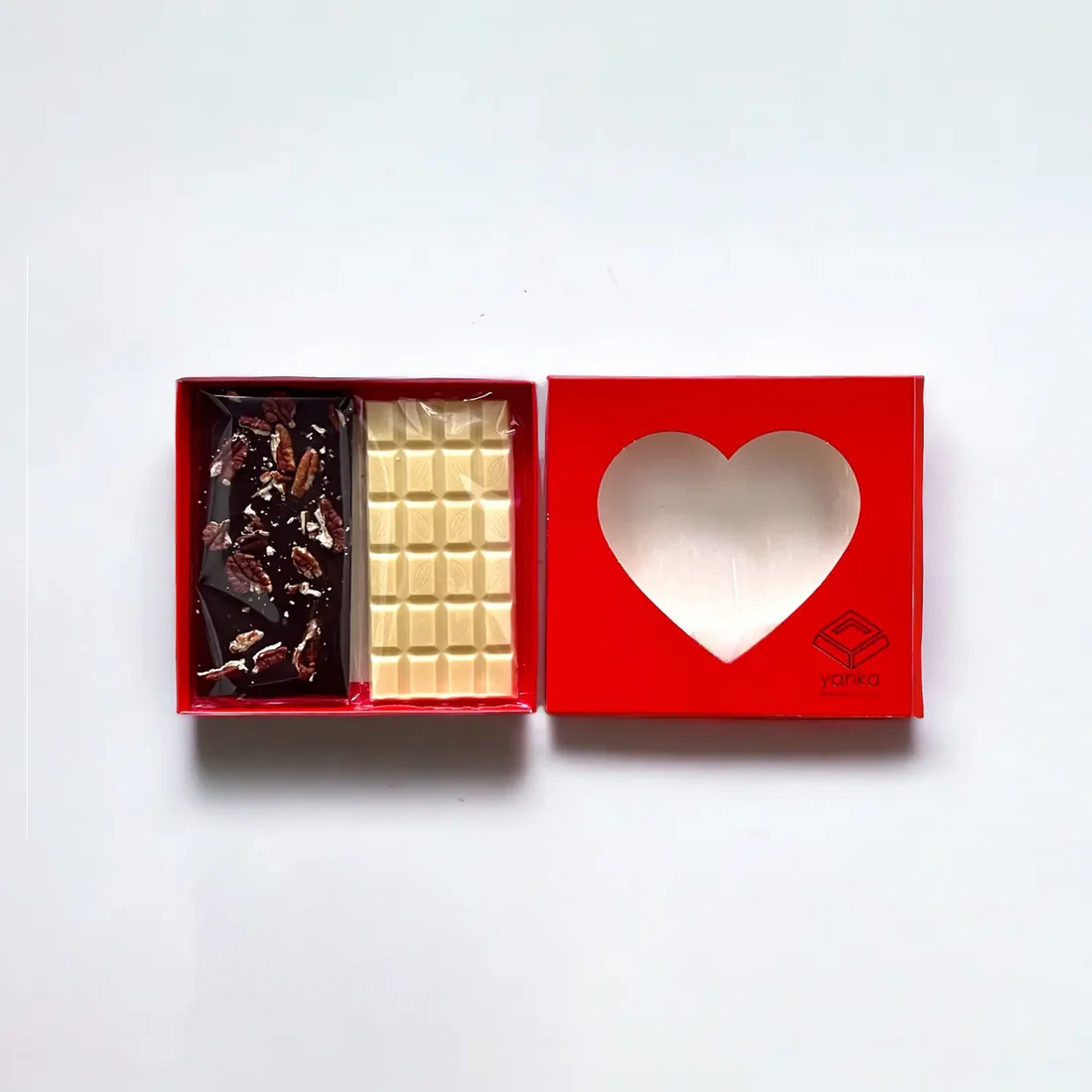 שתי טבלאות שוקולד בלגי מבית יאנקה שוקולד במארז לב אדום.