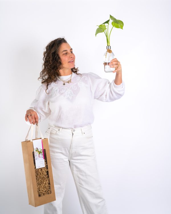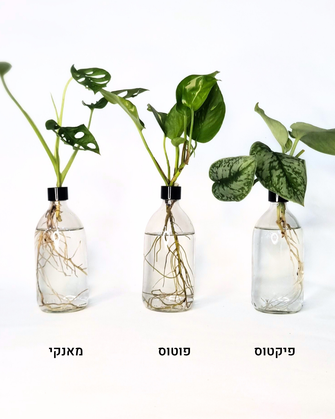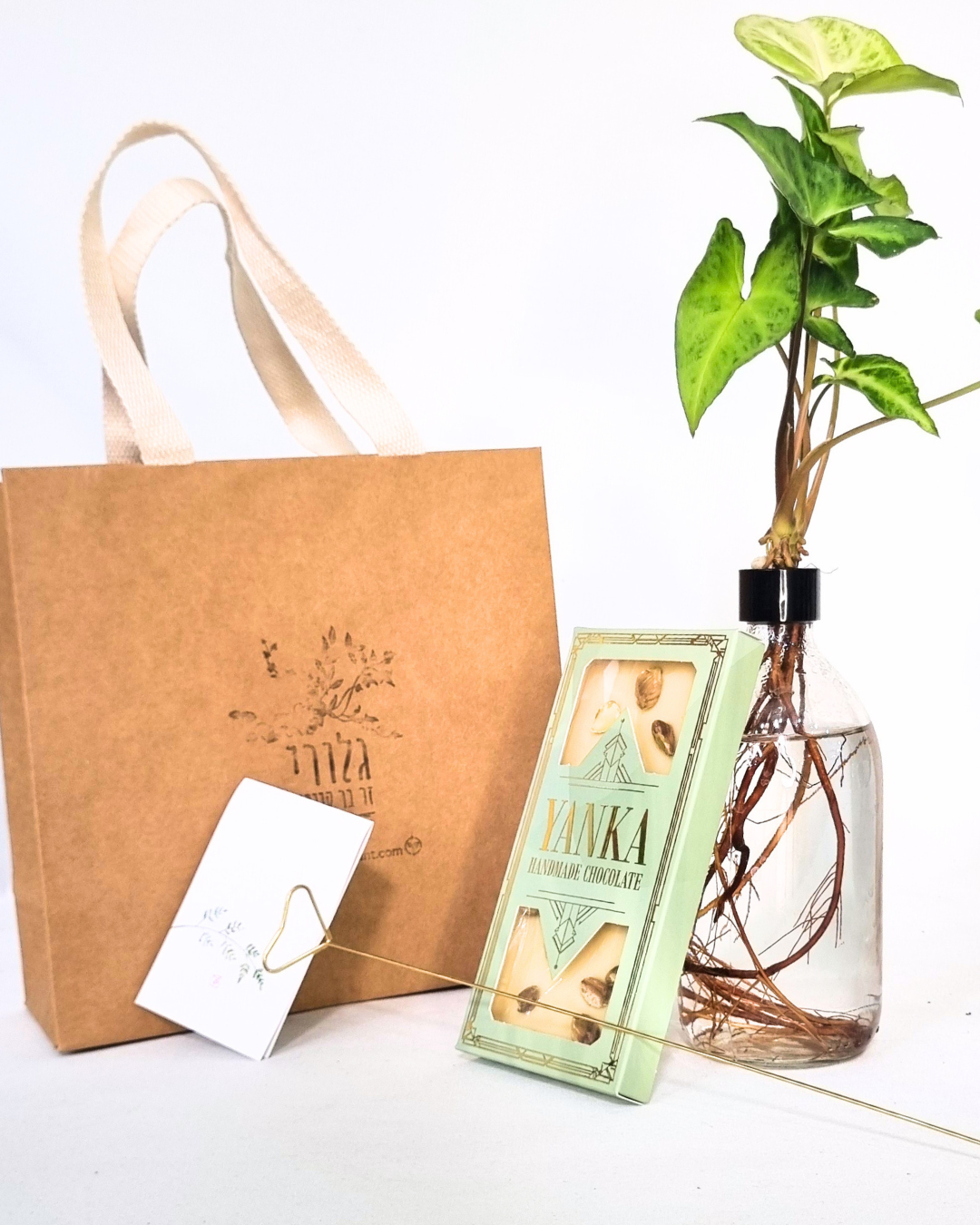 המארז כולל בקבוק עם צמח הידרופוני שיצמח בבית ללא טיפול במשך תקופה ארוכה ושוקולד בלגי בעבודת יד מבית יאנקה שוקולד.