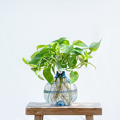 זר פוטוס הידרופוני שופע באגרטל זכוכית בועה שקוף בעל גוון אפור עדין – מתנה ייחודית ויוצאת דופן.